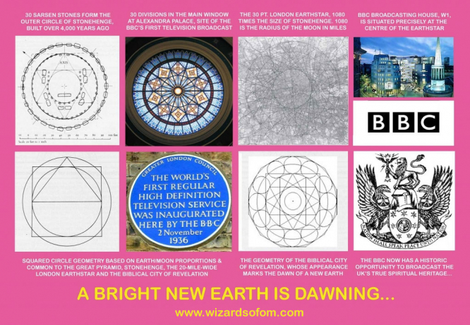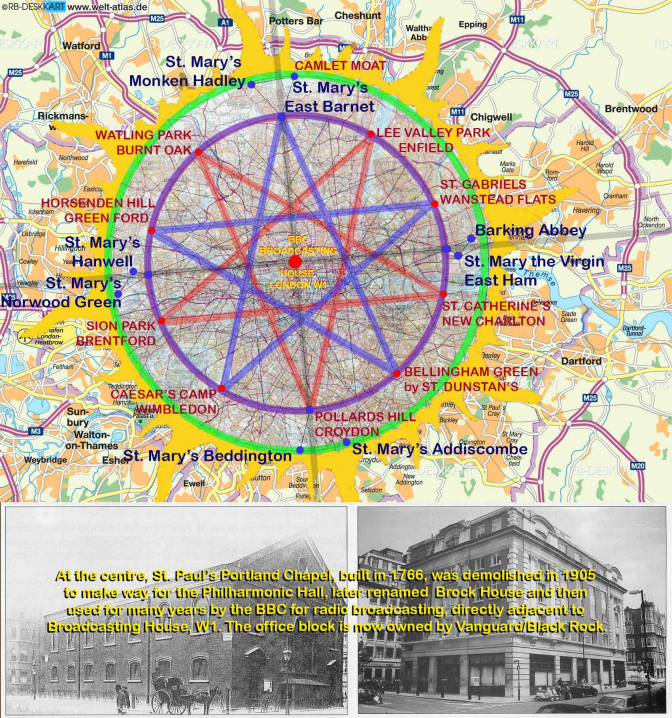 In more than 100 years of broadcasting, the worlds largest broadcaster, employing over 21,000 people, has NEVER mentioned the now well-established fact that its London headquarters, BBC Broadcasting House, Portland Place, W1A 1AA is sited in the very centre of the world's largest and most powerful earth energy mandala, a 20-mile-wide, 400-square-mile multi-layered, star-patterned Matrix of Creation situated within two concentric circles 1080 times the size of Stonehenge (1080 is the radius of the moon in miles).